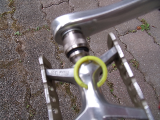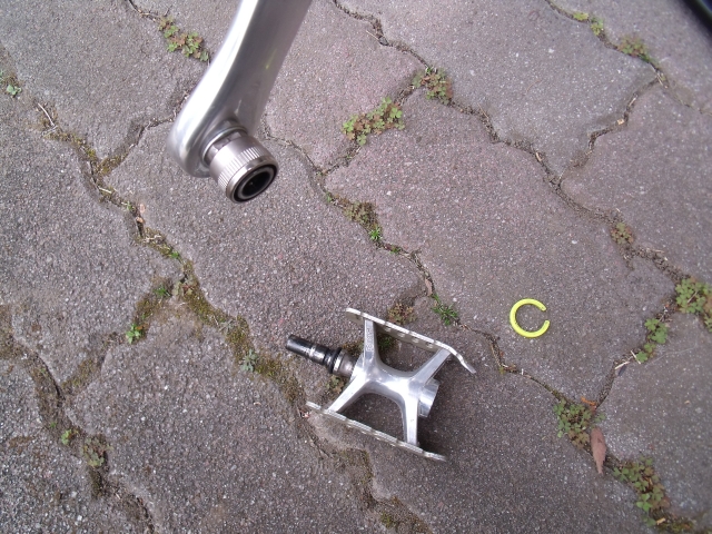 ペダルの軸には、ベアリングの油がべっとりなので、要注意!