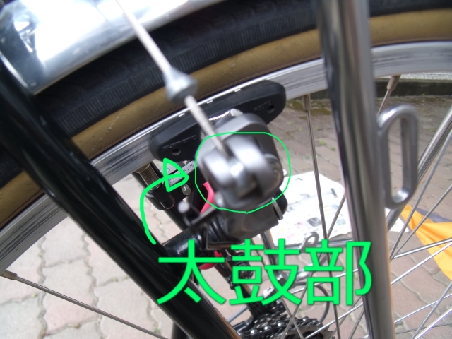 そして、ワイヤーはブレーキの中の回転するパーツに引っかかってます。