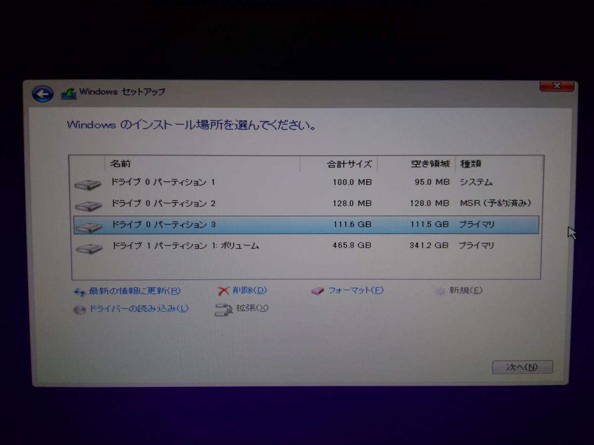 「インストール場所を選んでください」と出たら、OSが入っていたドライブを選ぶのだが、その前に、この画面でやることがある。