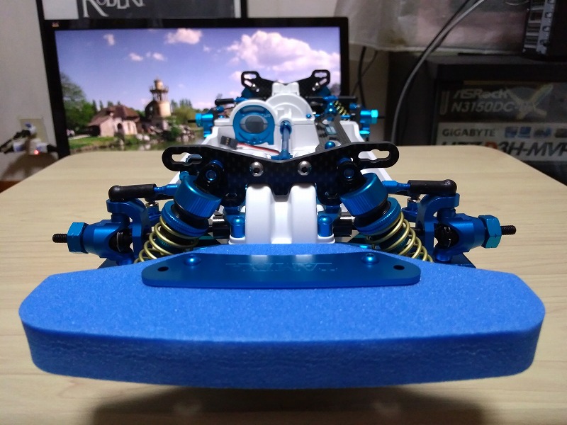 フロントにも付ける予定だったんだけど、アルミブリッジを付けたままスタビを入れると、どうしてもダンパーに干渉してしまう。
